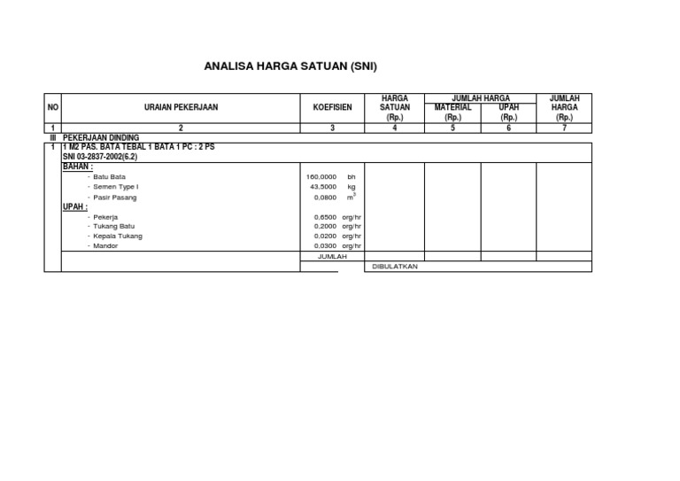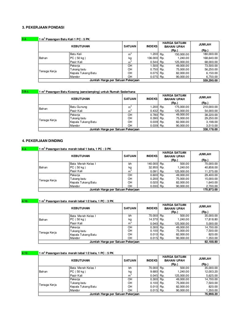 4 PP Bahan Bata Merah Buah 1400000 30000 Semen Portland Kg 265500 110000 Pasir Pasang M3 00930 11389700 Tenaga Kerja Pekerja OH 06000 3800000 Tukang Batu OH 02000 50000. K3 Pemasangan 1 m2 bekisting untuk pondasi 21. Konstruksi Dinding Batu Bata.